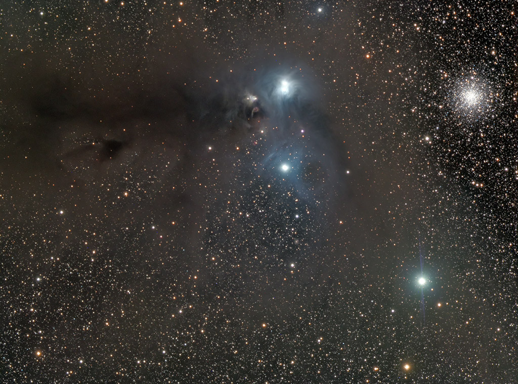 yellowish nebula (NGC 6729) surrounds young variable star R Coronae Australis. Magnificent globular star cluster